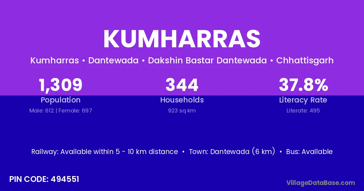 Dantewada (6 km) is the nearest town to Kumharras village for major economic activities and is located approximately 6 km away.