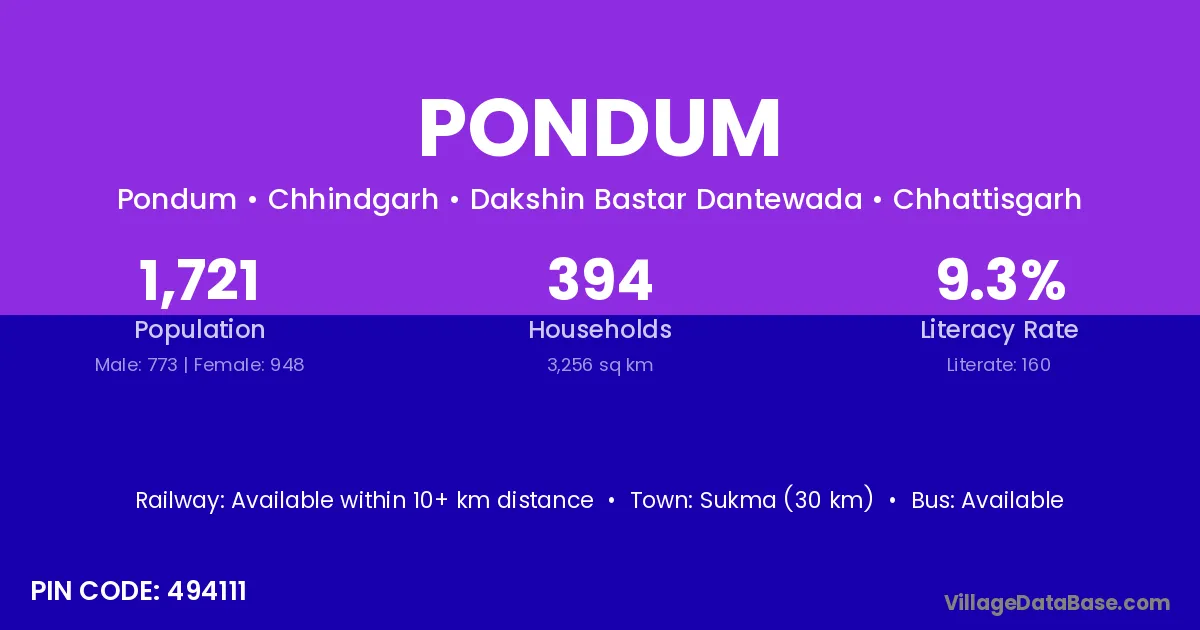 Dantewada (11 km) is the nearest town to Pondum village for major economic activities and is located approximately 11 km away.