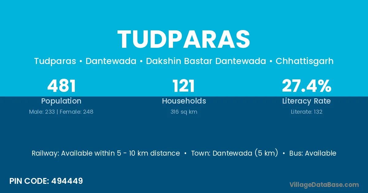 Dantewada (5 km) is the nearest town to Tudparas village for major economic activities and is located approximately 5 km away.