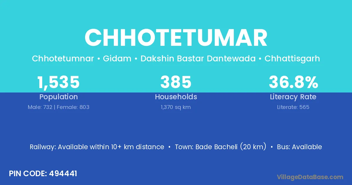 Bade Bacheli (20 km) is the nearest town to Chhotetumar village for major economic activities and is located approximately 20 km away.