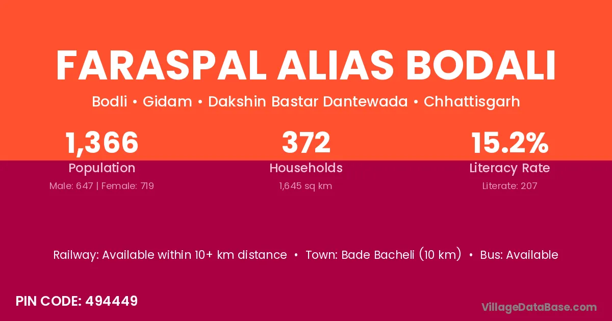 Faraspal Alias Bodali village has a total population of 1,366 people, of which 647 are males and 719 are females.