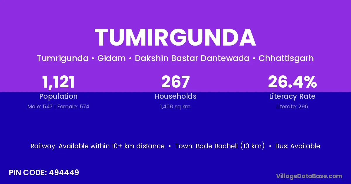 Bade Bacheli (10 km) is the nearest town to Tumirgunda village for major economic activities and is located approximately 10 km away.