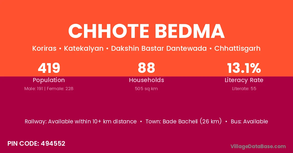 Bade Bacheli (26 km) is the nearest town to Chhote Bedma village for major economic activities and is located approximately 26 km away.
