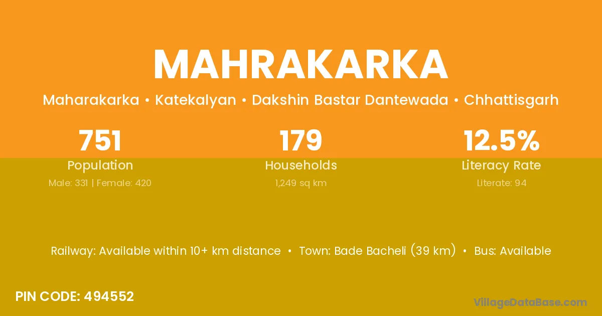 Bade Bacheli (39 km) is the nearest town to Mahrakarka village for major economic activities and is located approximately 39 km away.