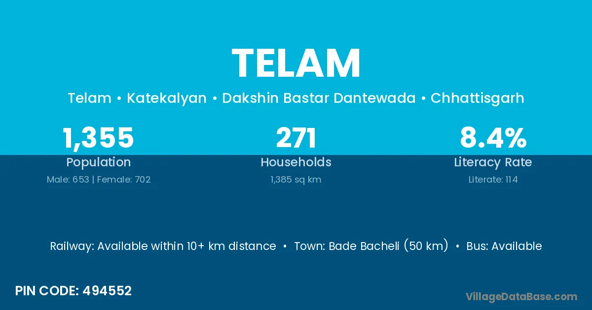 According to Census 2011 information, the village code of Telam village is 494552.
