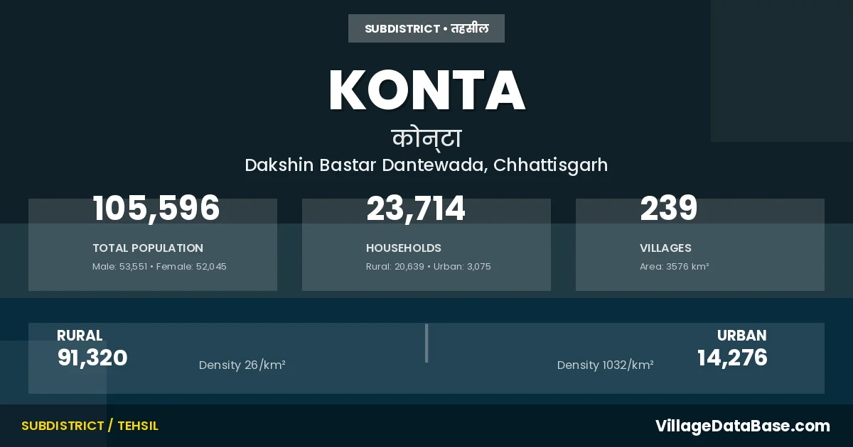 According to the 2011 census The total area of Konta Tehsil is 3576 km², with a population of 105596 people. The population density is 30 inhabitants per square kilometre, and there are approximately 23714 houses in the sub district.