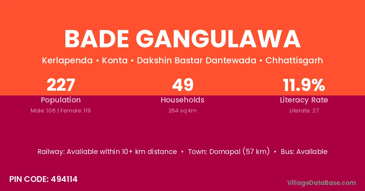 Bade Gangulawa village has a total population of 227 people, of which 108 are males and 119 are females.