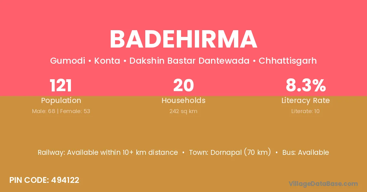 Dornapal (70 km) is the nearest town to Badehirma village for major economic activities and is located approximately 70 km away.