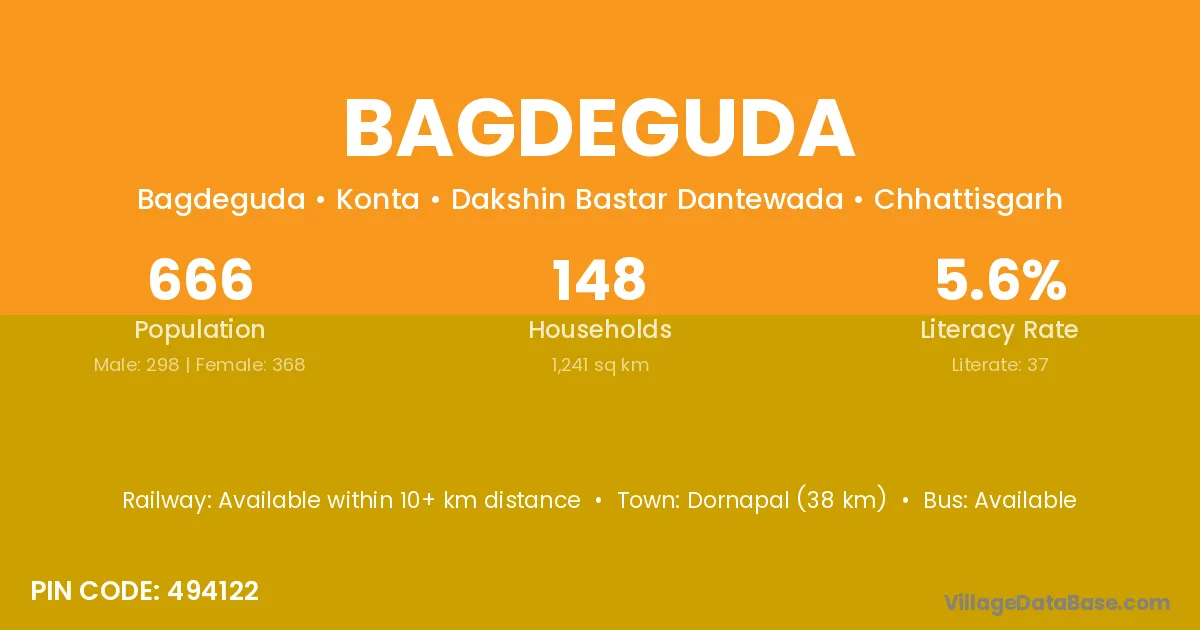Dornapal (38 km) is the nearest town to Bagdeguda village for major economic activities and is located approximately 38 km away.