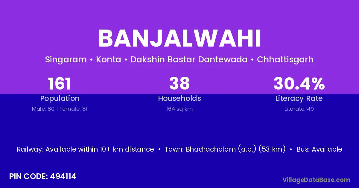 Bhadrachalam (a.p.) (53 km) is the nearest town to Banjalwahi village for major economic activities and is located approximately 53 km away.