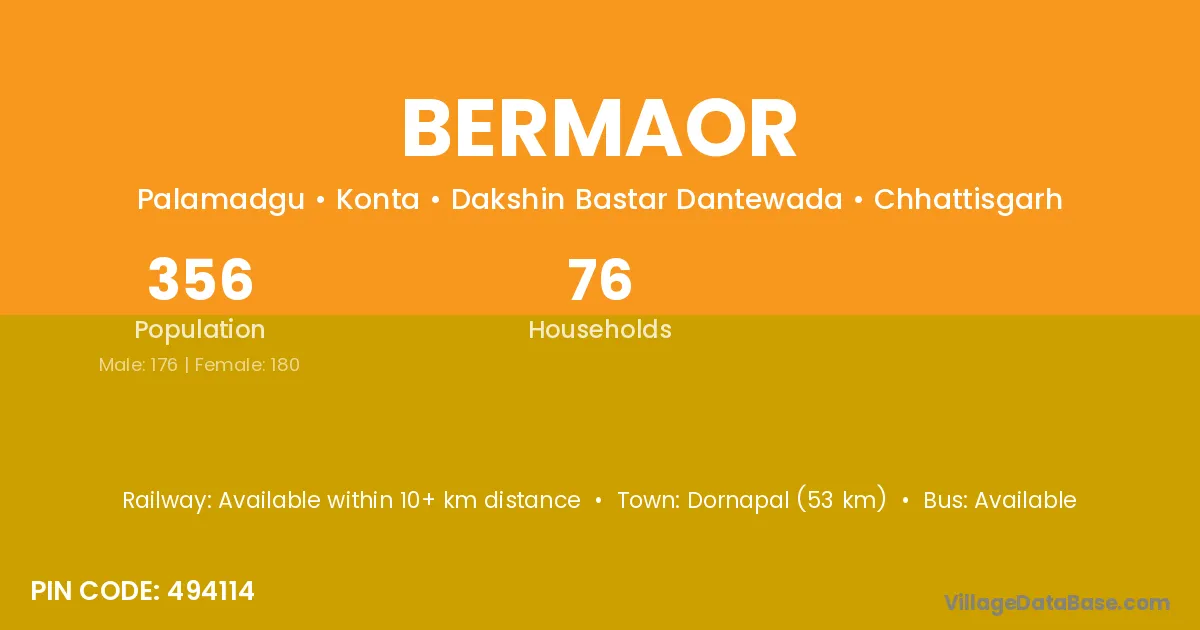 Dornapal (53 km) is the nearest town to Bermaor village for major economic activities and is located approximately 53 km away.
