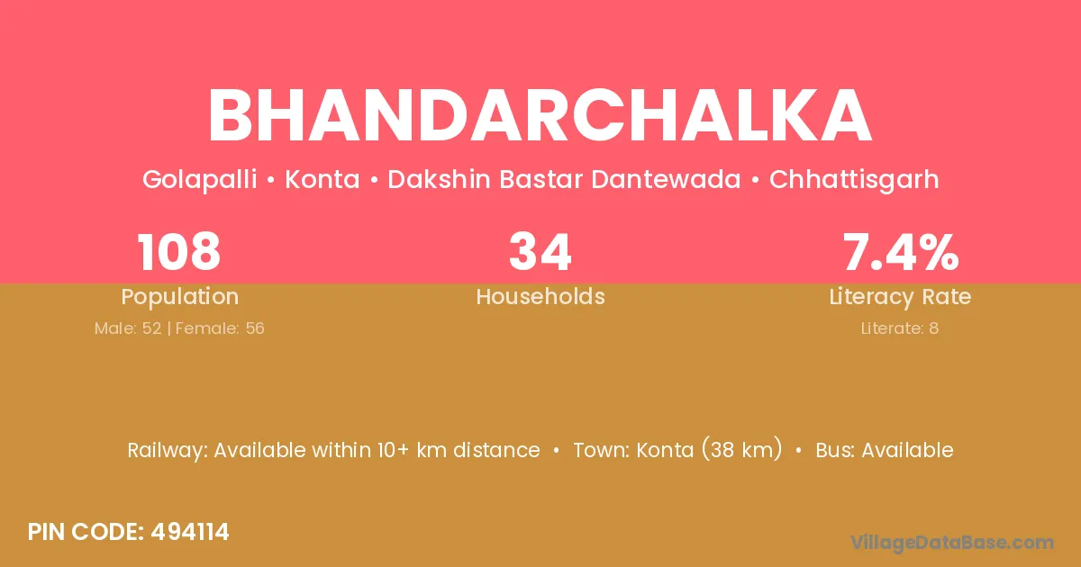 According to Census 2011 information, the village code of Bhandarchalka village is 494114.