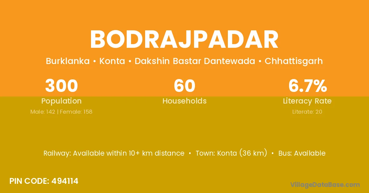 The literacy rate of Bodrajpadar village is 6.67%. Male literacy stands at 10.56% and female literacy at 3.16%.