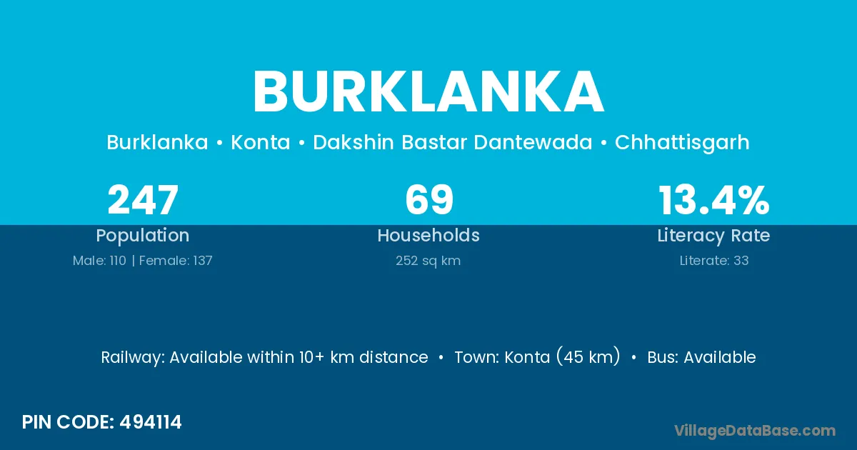 According to Census 2011 information, the village code of Burklanka village is 494114.