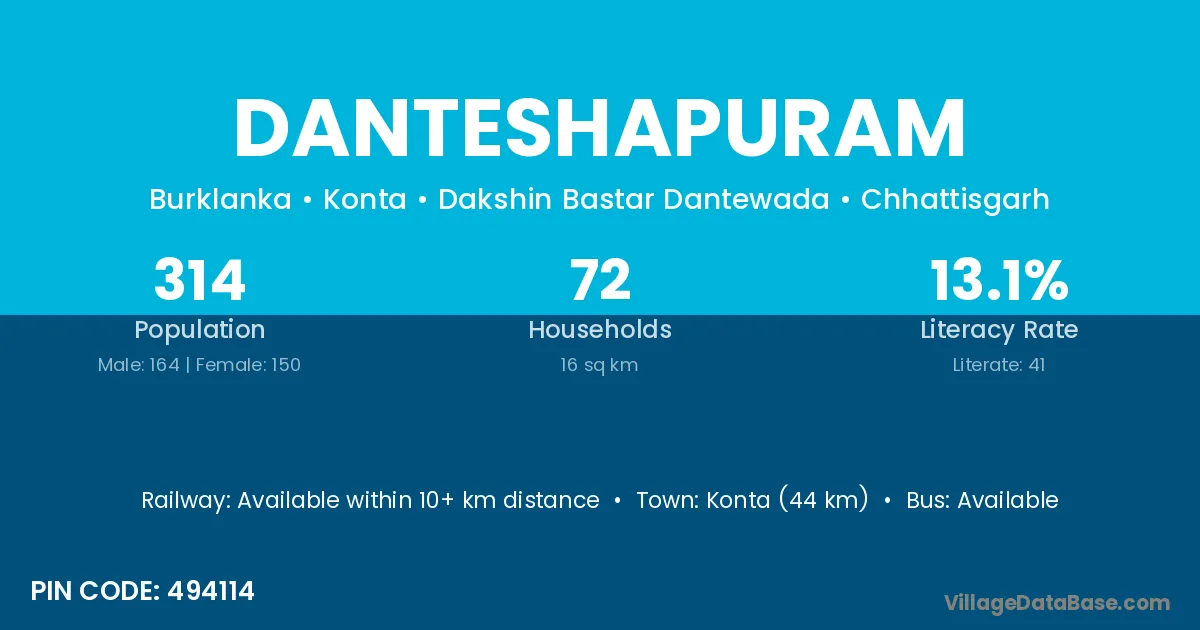 According to Census 2011 information, the village code of Danteshapuram village is 494114.