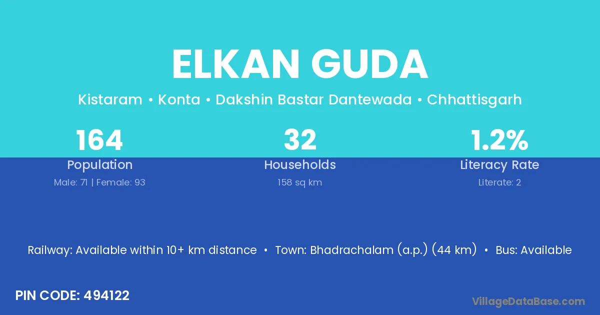 Bhadrachalam (a.p.) (44 km) is the nearest town to Elkan Guda village for major economic activities and is located approximately 44 km away.