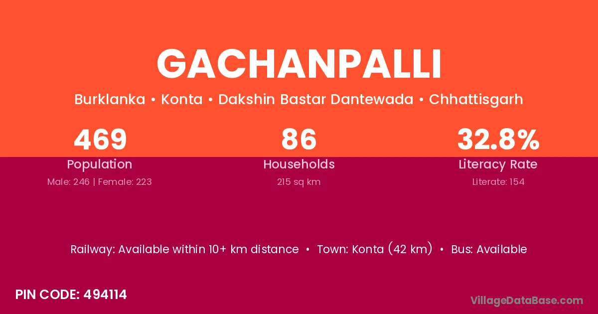 Konta (42 km) is the nearest town to Gachanpalli village for major economic activities and is located approximately 42 km away.