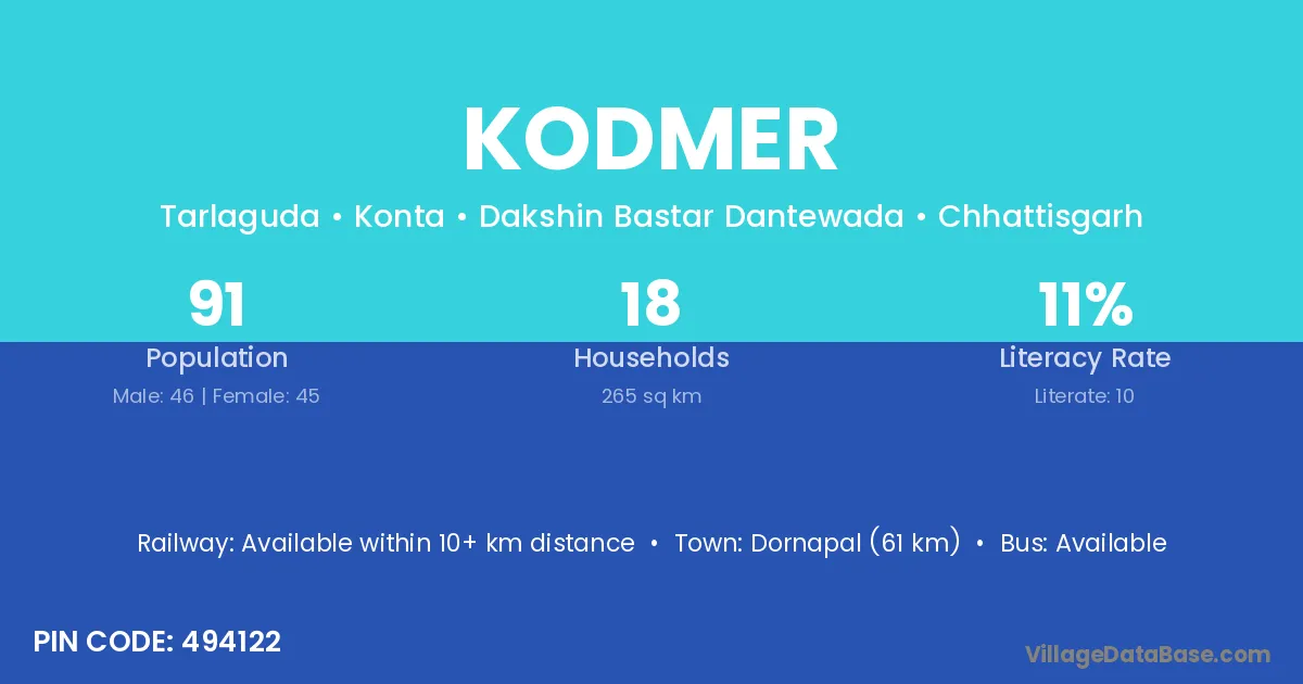 Dornapal (61 km) is the nearest town to Kodmer village for major economic activities and is located approximately 61 km away.