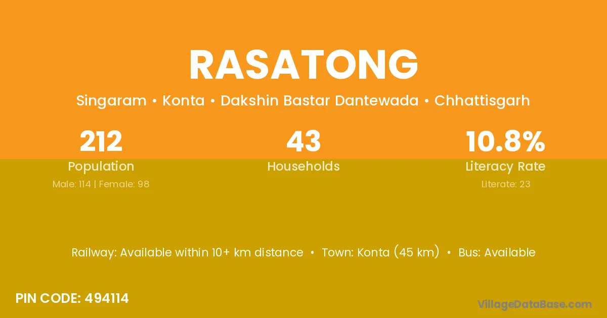 According to Census 2011 information, the village code of Rasatong village is 494114.