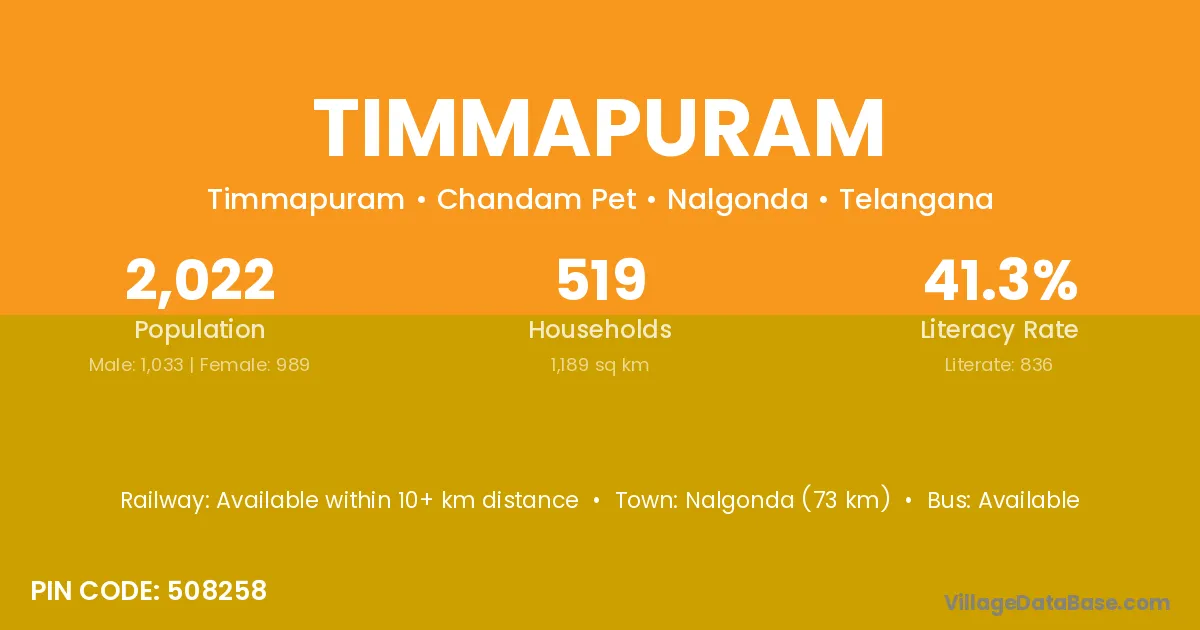 The literacy rate of Timmapuram village is 35.89%. Male literacy stands at 41.28% and female literacy at 30.00%.