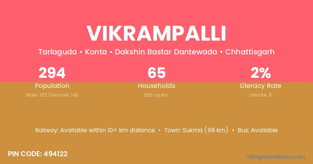 Sukma (99 km) is the nearest town to Vikrampalli village for major economic activities and is located approximately 99 km away.
