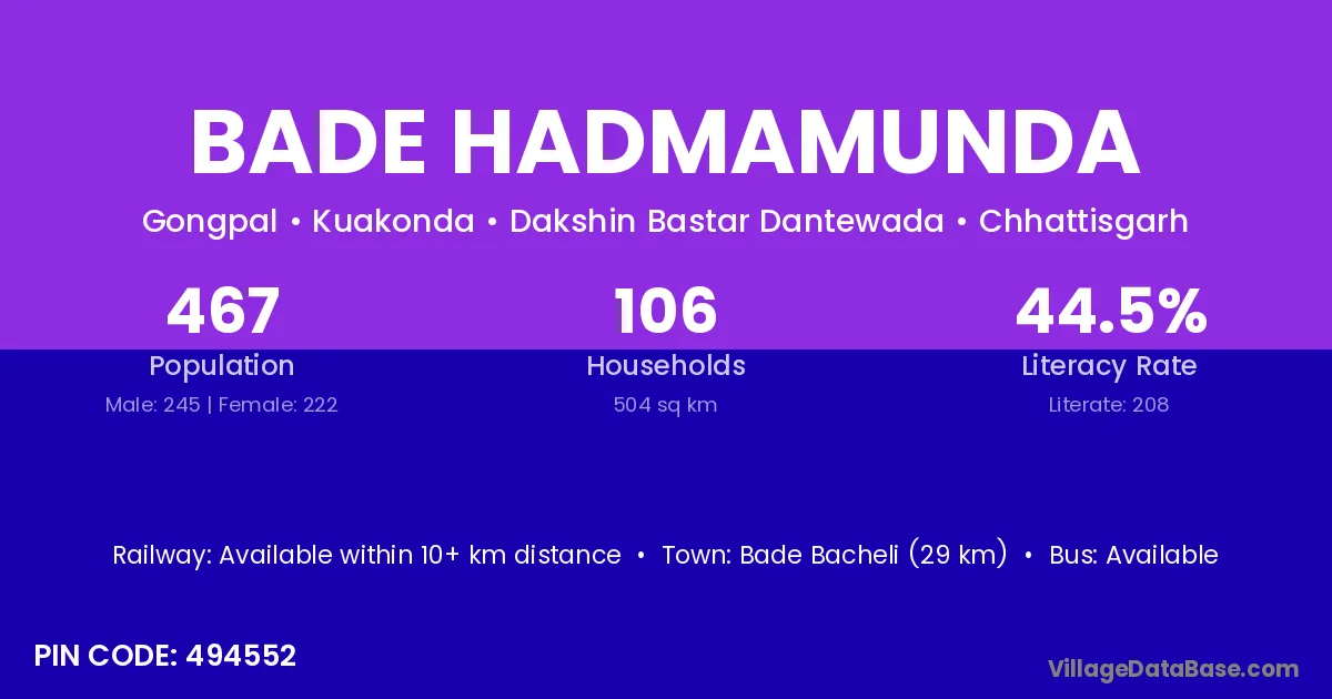 Bade Bacheli (29 km) is the nearest town to Bade Hadmamunda village for major economic activities and is located approximately 29 km away.