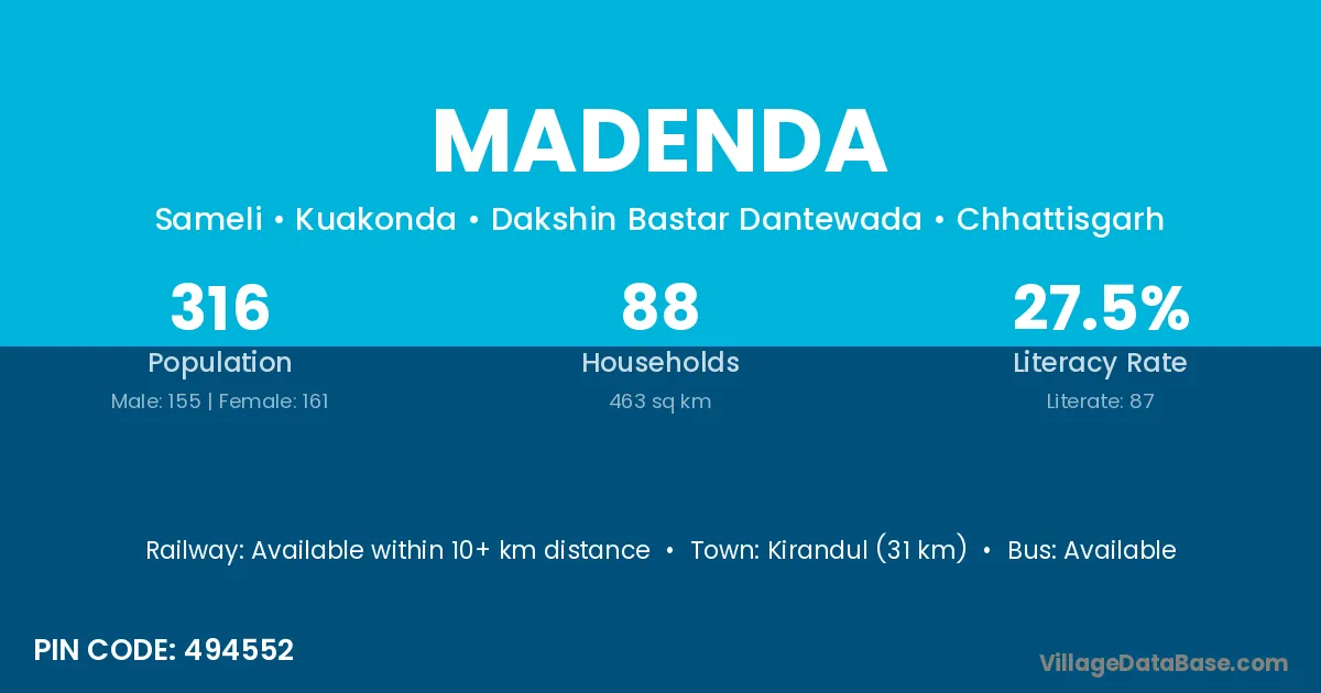 Kirandul (31 km) is the nearest town to Madenda village for major economic activities and is located approximately 31 km away.