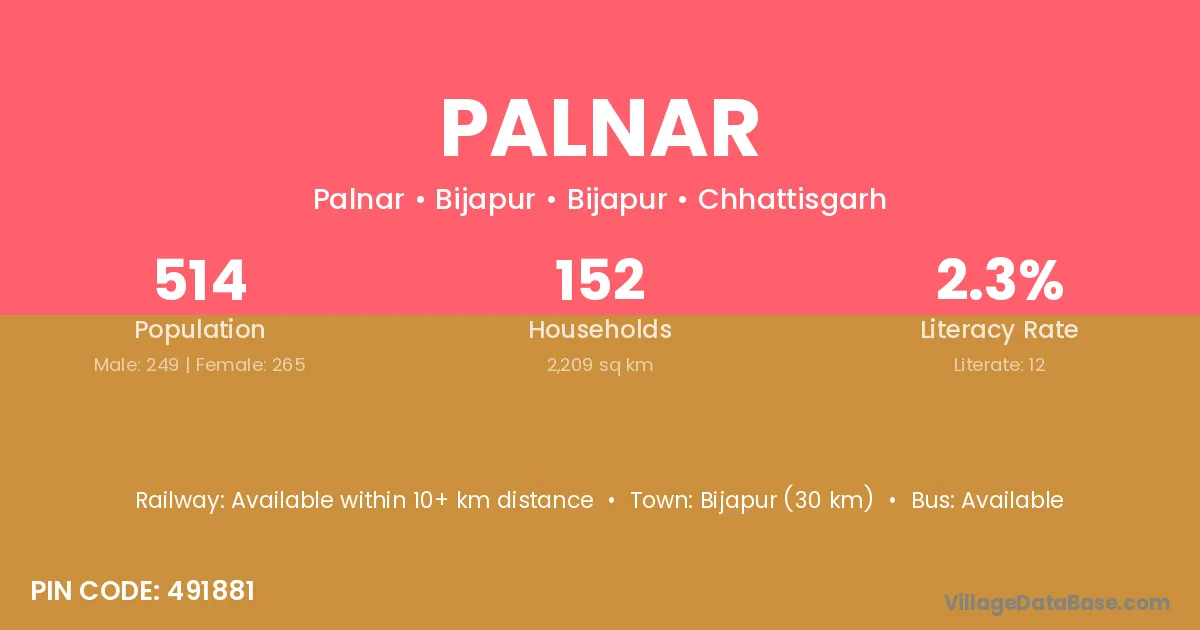 Kirandul (18 km) is the nearest town to Palnar village for major economic activities and is located approximately 18 km away.