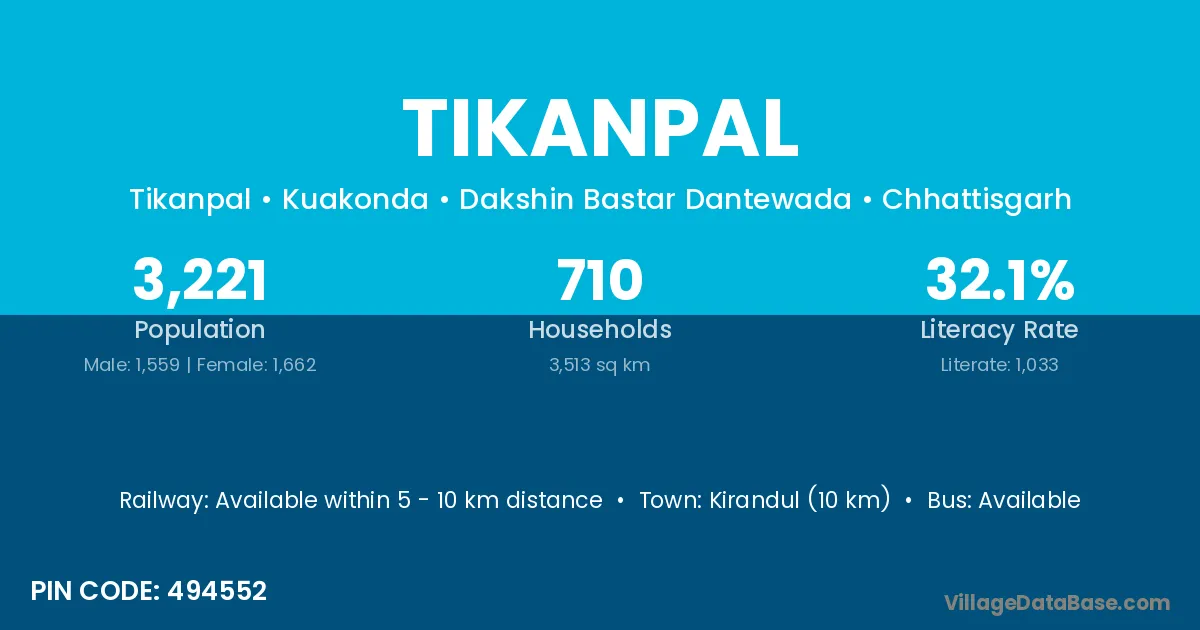Kirandul (10 km) is the nearest town to Tikanpal village for major economic activities and is located approximately 10 km away.