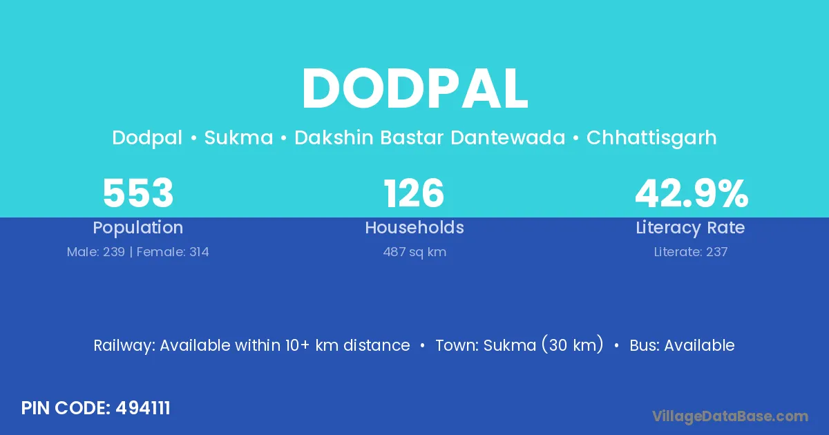 Sukma (30 km) is the nearest town to Dodpal village for major economic activities and is located approximately 30 km away.