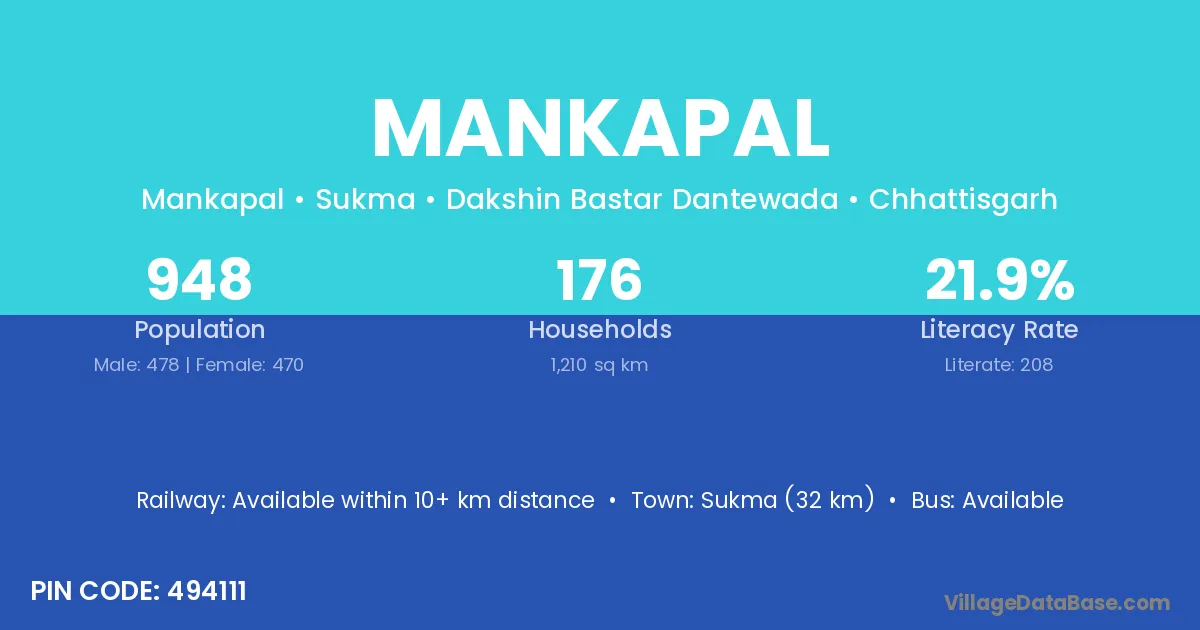 Sukma (32 km) is the nearest town to Mankapal village for major economic activities and is located approximately 32 km away.