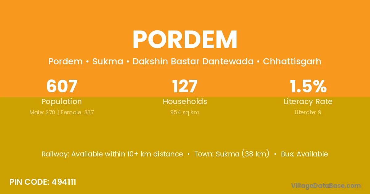Sukma (38 km) is the nearest town to Pordem village for major economic activities and is located approximately 38 km away.