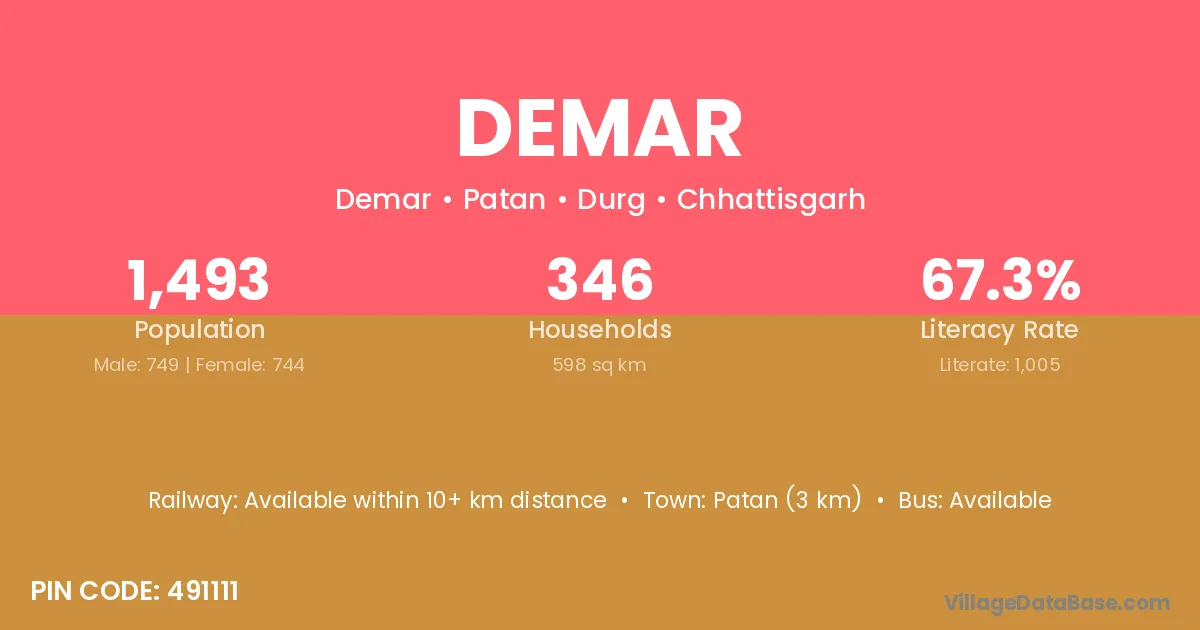 Dhamtari (8 km) is the nearest town to Demar village for major economic activities and is located approximately 8 km away.