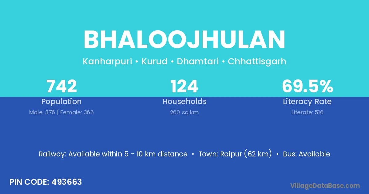 Raipur (62 km) is the nearest town to Bhaloojhulan village for major economic activities and is located approximately 62 km away.