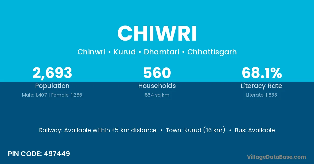 Kurud (16 km) is the nearest town to Chiwri village for major economic activities and is located approximately 16 km away.