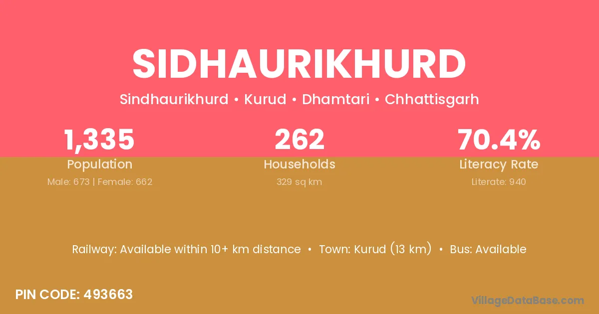 Kurud (13 km) is the nearest town to Sidhaurikhurd village for major economic activities and is located approximately 13 km away.