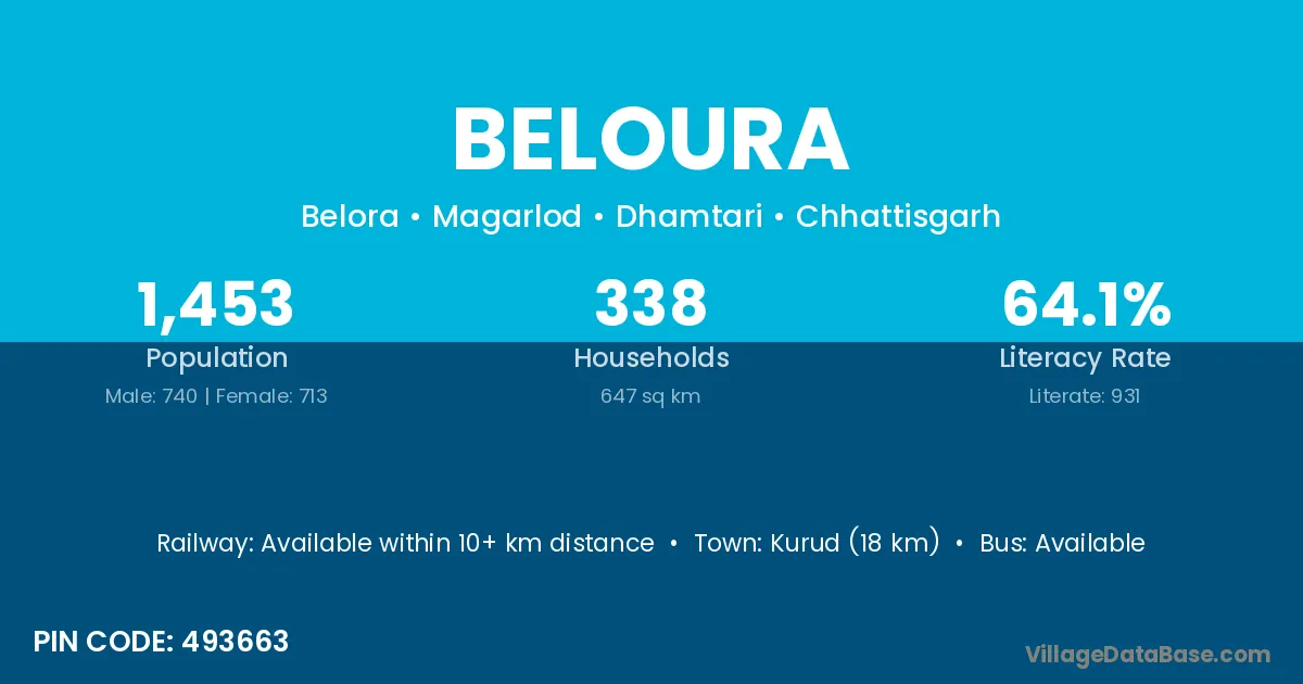 Kurud (18 km) is the nearest town to Beloura village for major economic activities and is located approximately 18 km away.