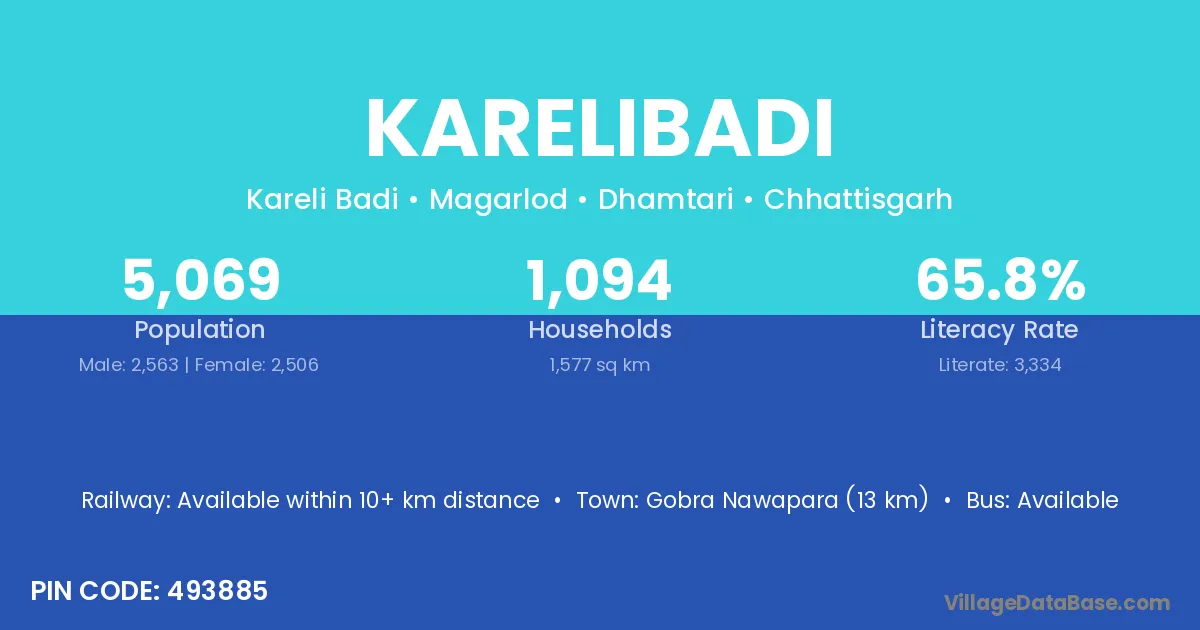 Gobra Nawapara (13 km) is the nearest town to Karelibadi village for major economic activities and is located approximately 13 km away.
