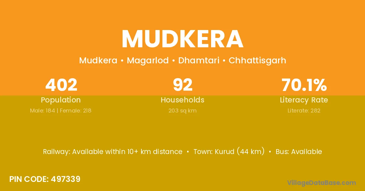 Kurud (44 km) is the nearest town to Mudkera village for major economic activities and is located approximately 44 km away.