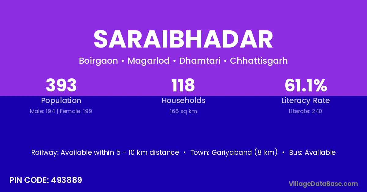 Gariyaband (8 km) is the nearest town to Saraibhadar village for major economic activities and is located approximately 8 km away.