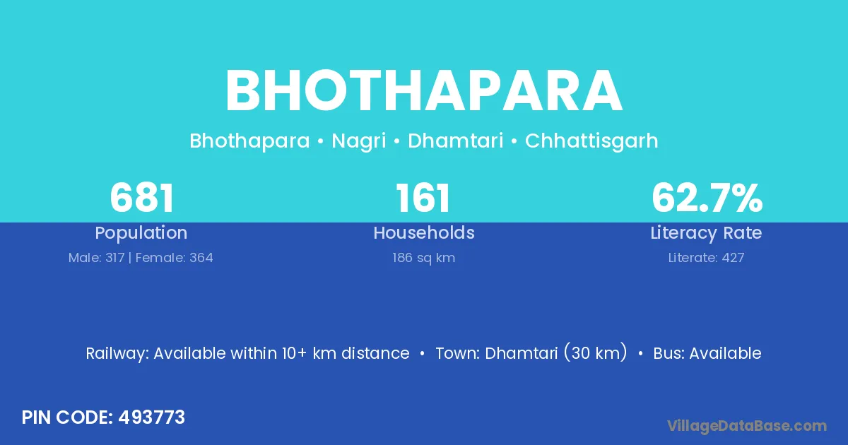 Dhamtari (30 km) is the nearest town to Bhothapara village for major economic activities and is located approximately 30 km away.