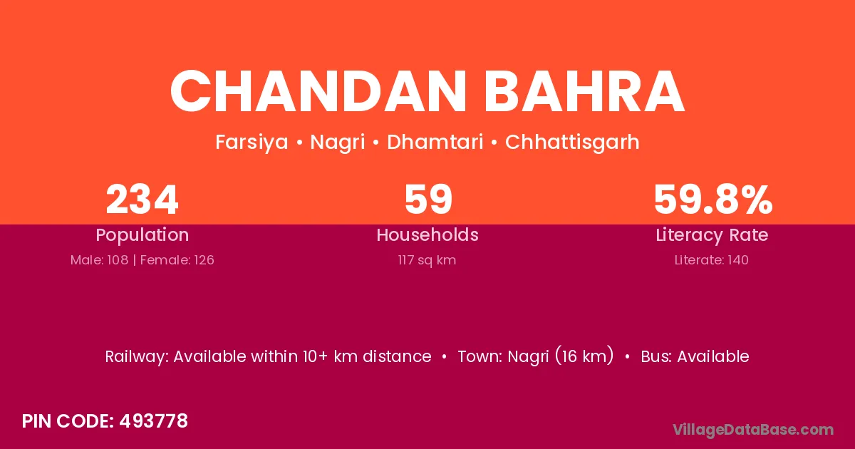 Chandan Bahra village has a total population of 234 people, of which 108 are males and 126 are females.