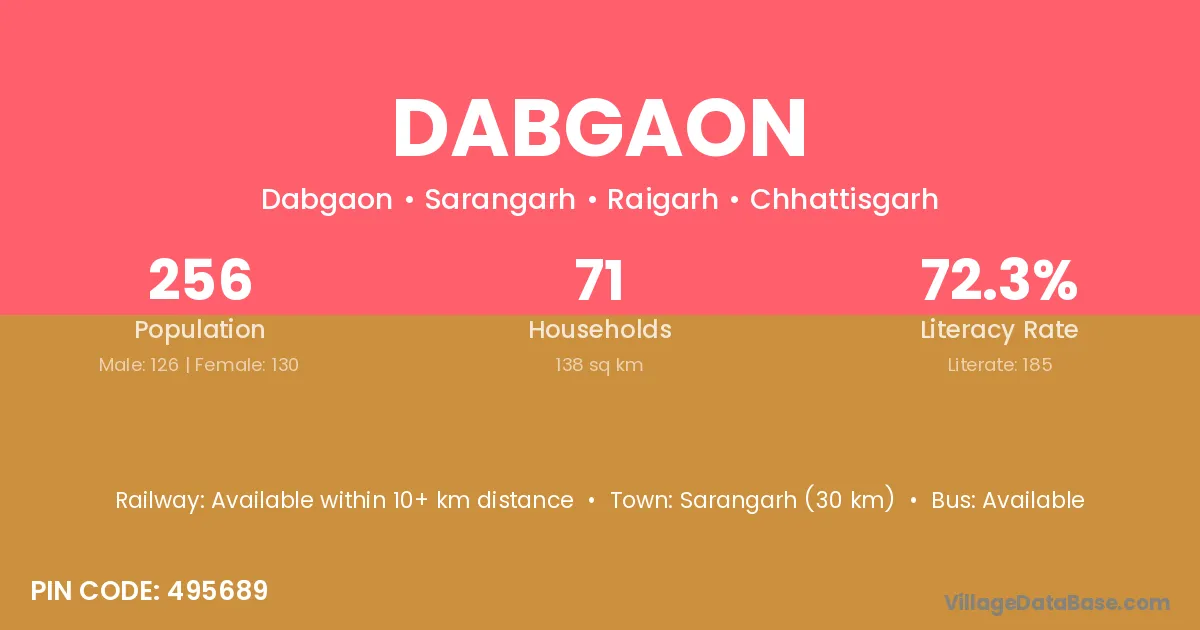 Nagri (18 km) is the nearest town to Dabgaon village for major economic activities and is located approximately 18 km away.