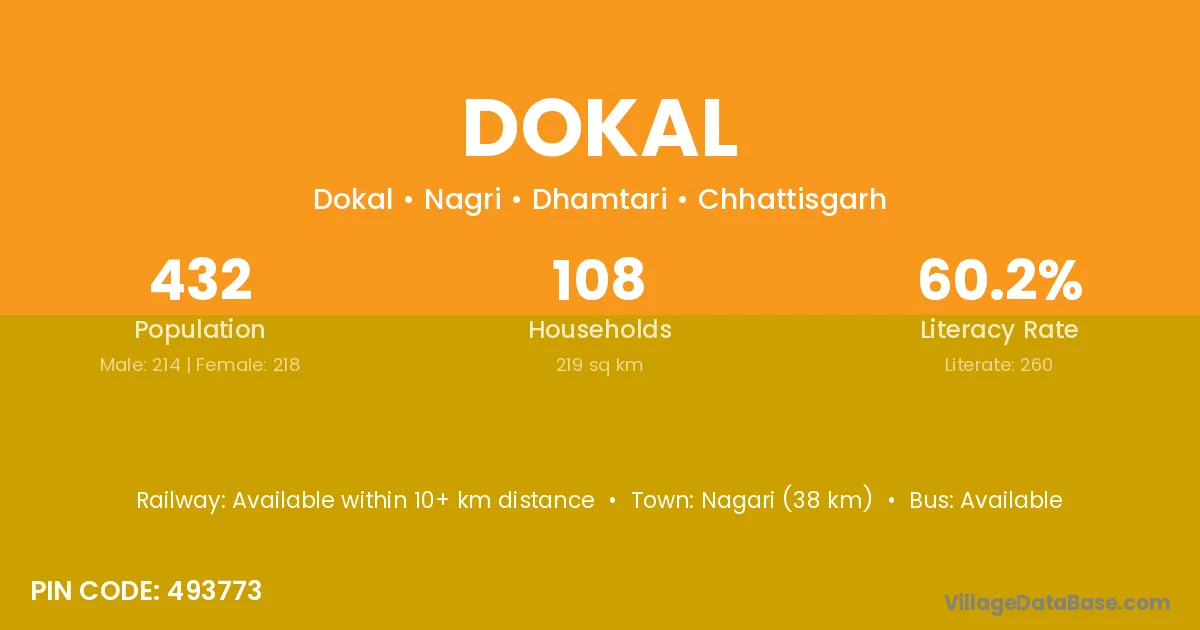Dokal village has a total population of 432 people, of which 214 are males and 218 are females.