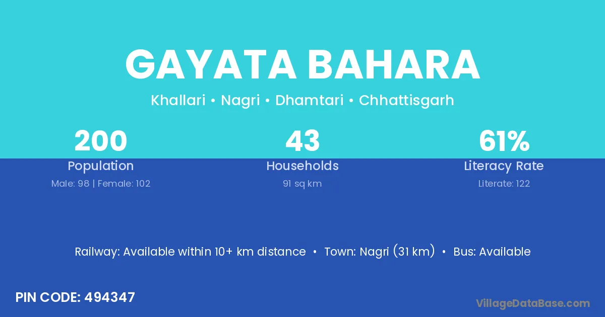 Nagri (31 km) is the nearest town to Gayata Bahara village for major economic activities and is located approximately 31 km away.
