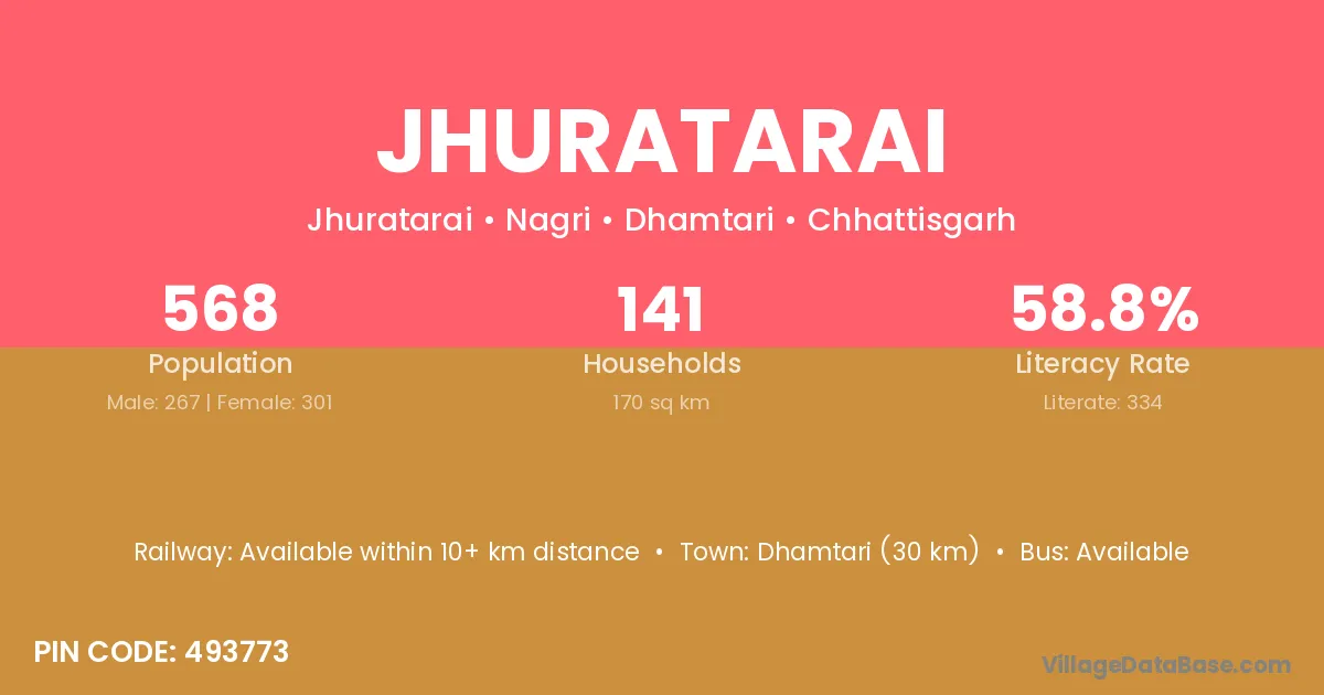 Dhamtari (30 km) is the nearest town to Jhuratarai village for major economic activities and is located approximately 30 km away.
