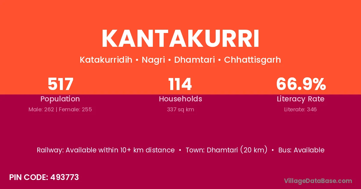 Dhamtari (20 km) is the nearest town to Kantakurri village for major economic activities and is located approximately 20 km away.