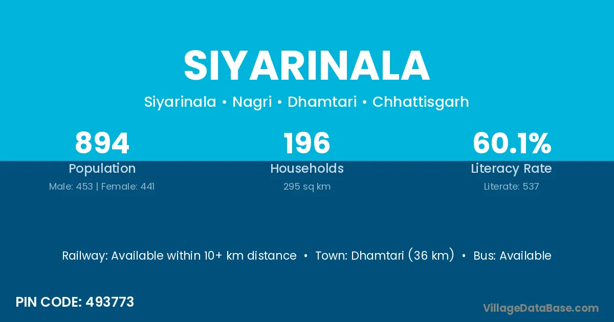 Dhamtari (36 km) is the nearest town to Siyarinala village for major economic activities and is located approximately 36 km away.