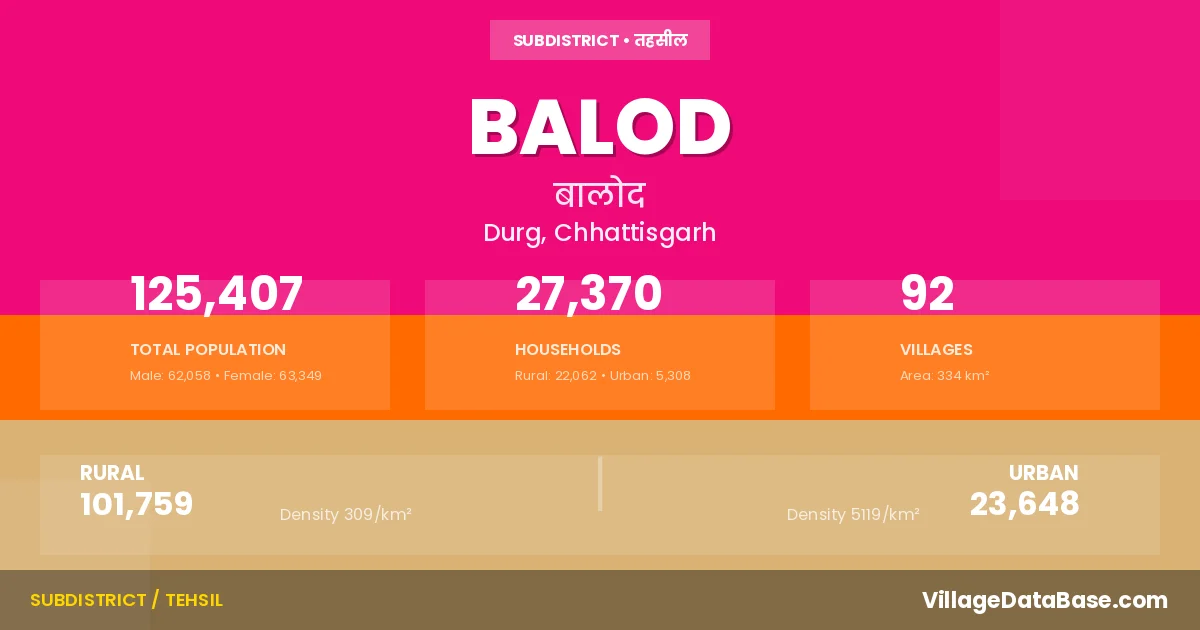 According to the 2011 census The total area of Balod Tehsil is 334 km², with a population of 125407 people. The population density is 376 inhabitants per square kilometre, and there are approximately 27370 houses in the sub district.