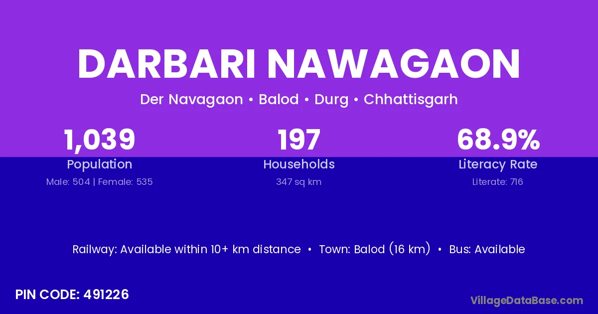 Balod (16 km) is the nearest town to Darbari Nawagaon village for major economic activities and is located approximately 16 km away.